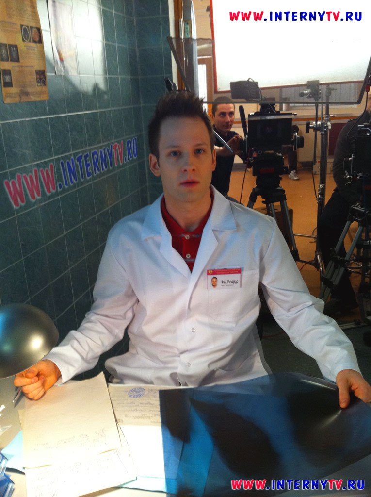 На роль нового интерна пророчили Алису Быкова (дочь Быкова, появившаяся в конце 3 сезона). Но как стало известно от от Ивана Охлобыстина, новым интерном станет... Фил, интерн из америки. Перед вами фотография нового интерна со съемочной площадки. Эта главная тайна была опубликована Иваном Охлобыстиным в его твиттере.